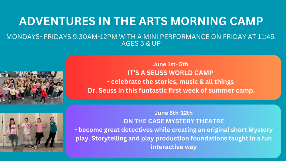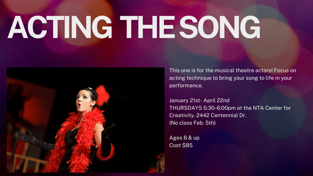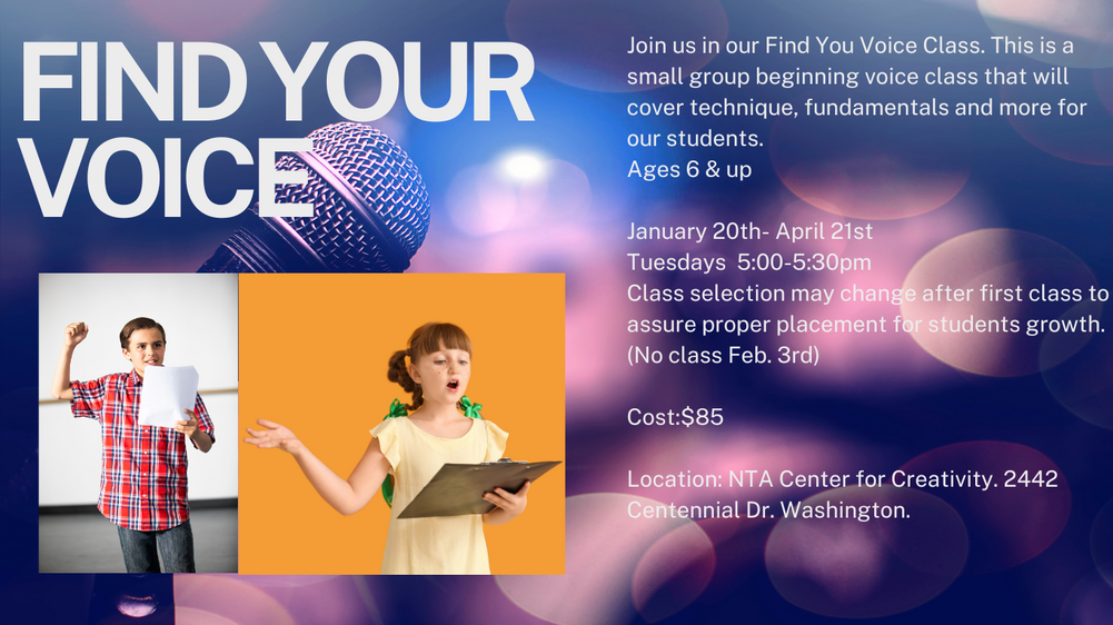 NTA Center For Creativity Thursday- May 1st 5-7:15pm. May 2nd Call time 4pm Show time 6:30 & May 3rd Call time 5:45 Show time 6:30.