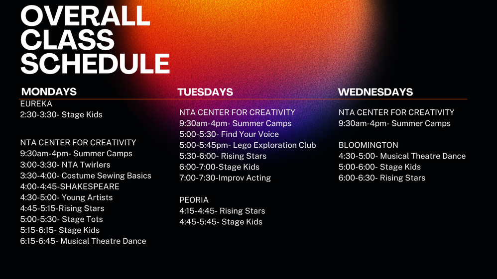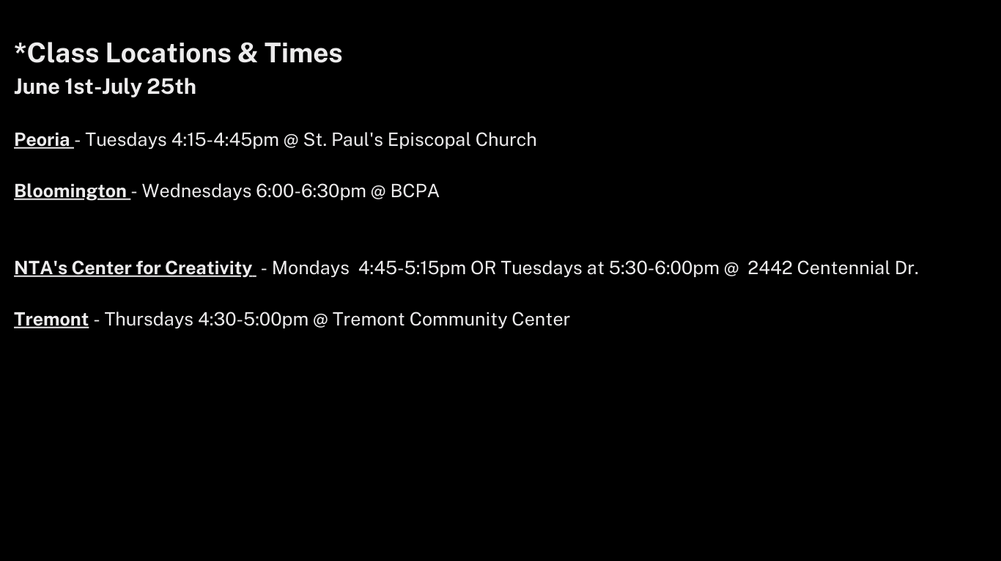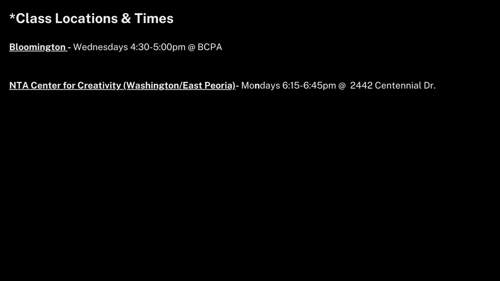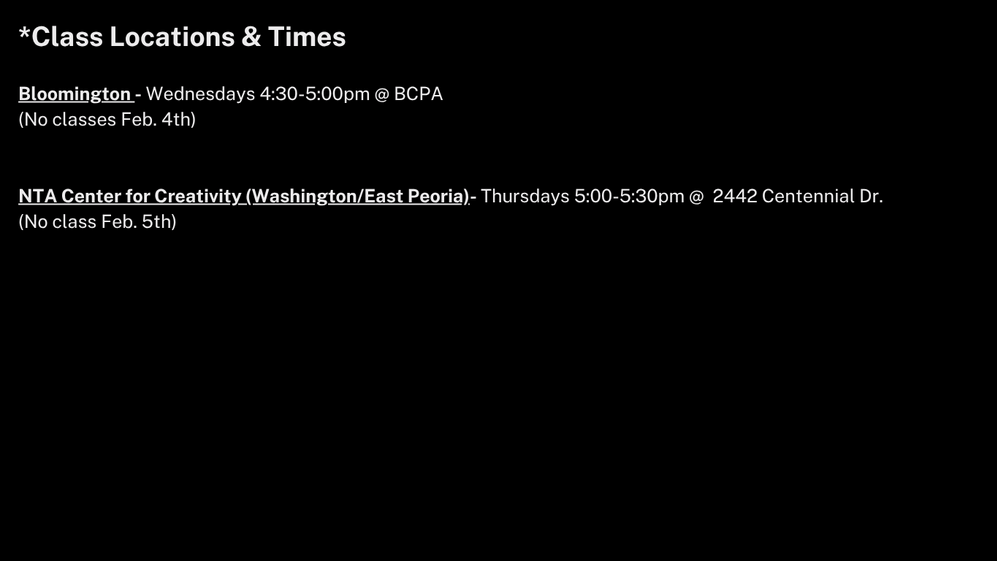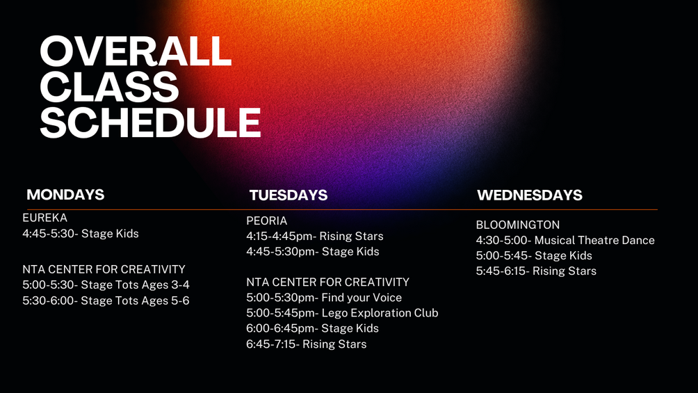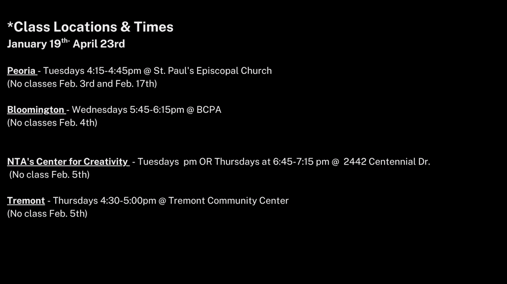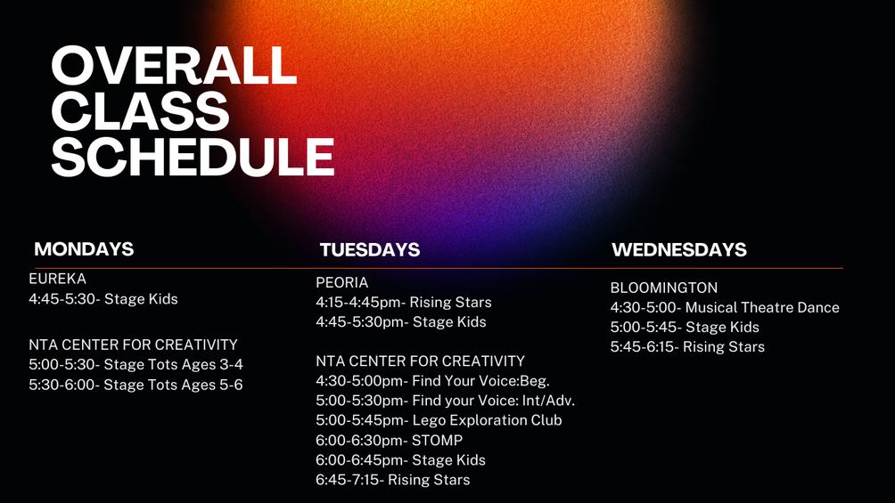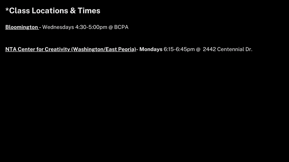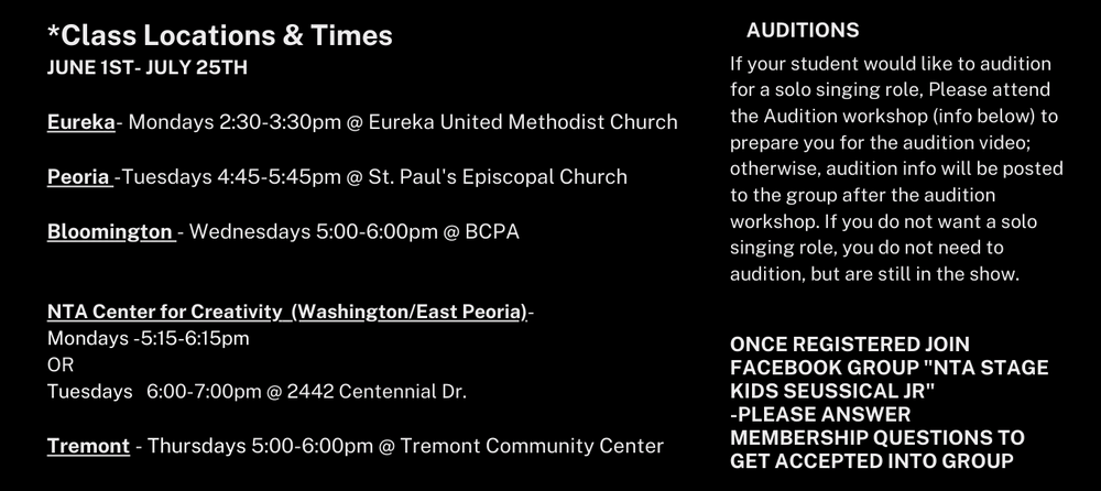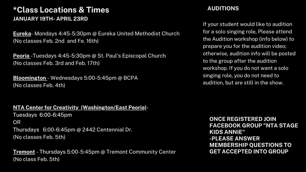 *All Spacings / Techs / Shows will be at the NTA Center for Creativity for all casts except Bloomington which will be at BCPA.