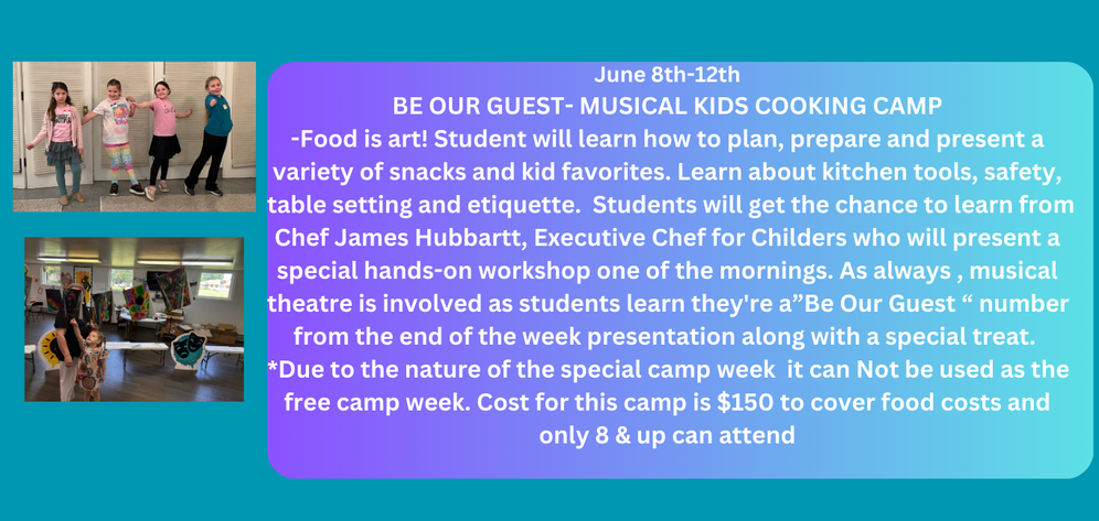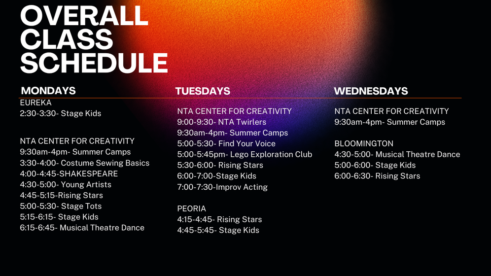 NTA Center for Creativity Monday - July 29th 4-6:30pm, July 30th Call time 4pm for 6:30 Show time & July 31st Call time 5:45 for 6:30 show time.