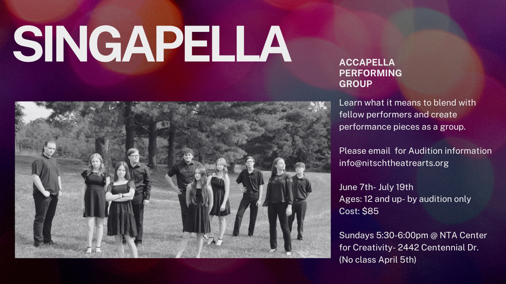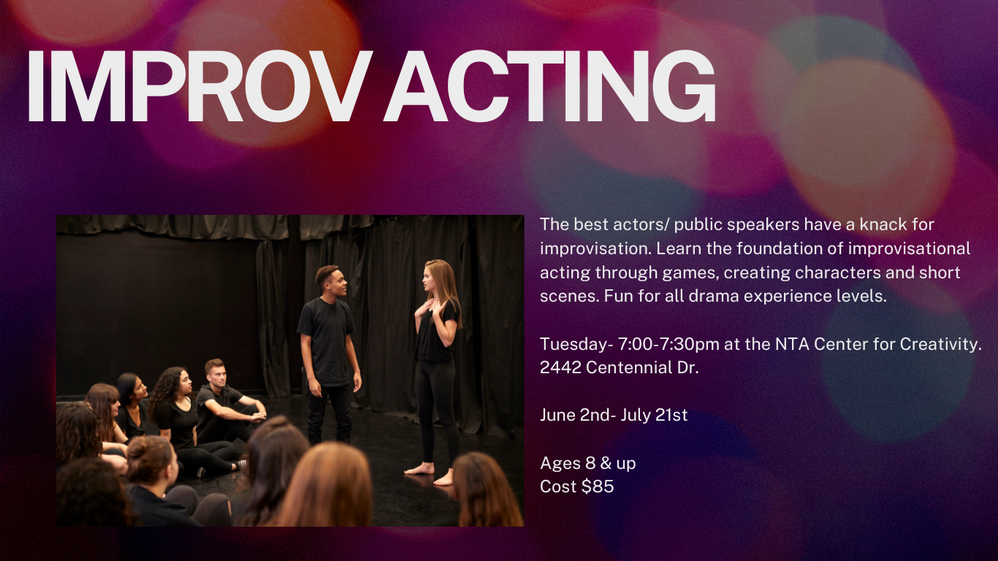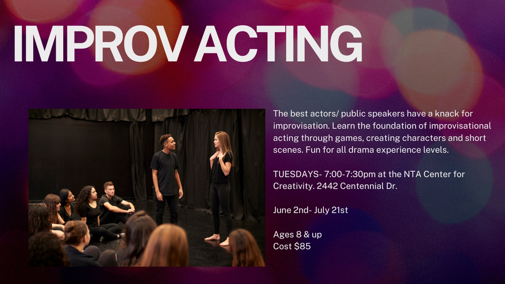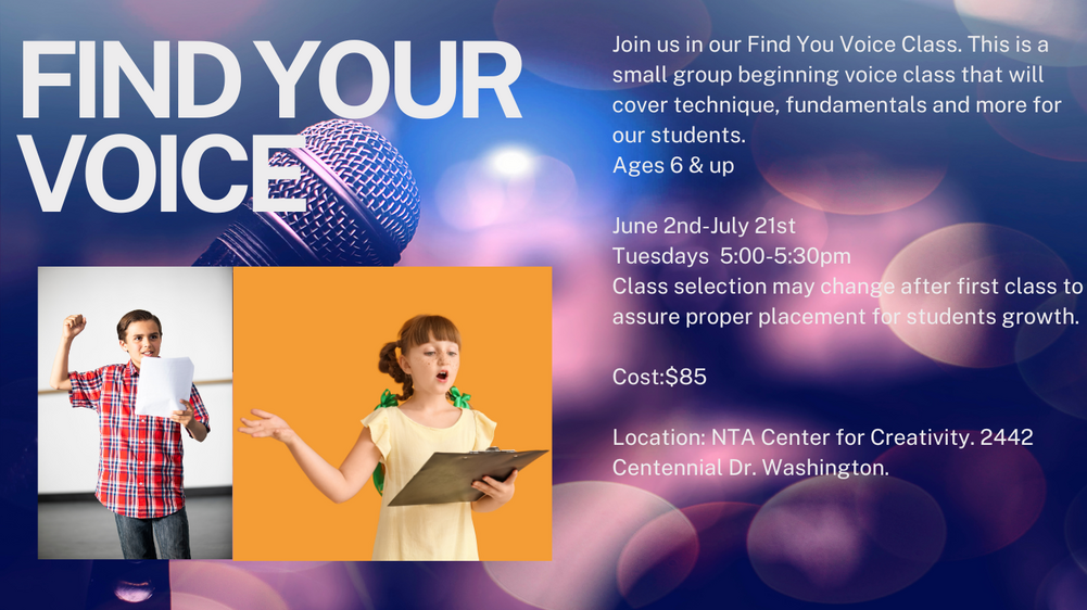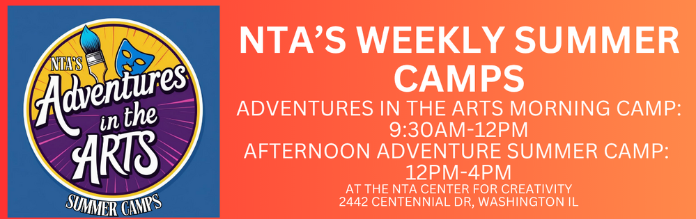 NTA Center For Creativity Tuesday- August 4th 4-6:30pm. August 5th Call time 4pm Show time 6:30 & August 6th Call time 5:45 Show time 6:30.