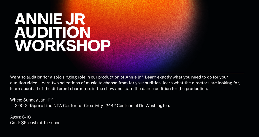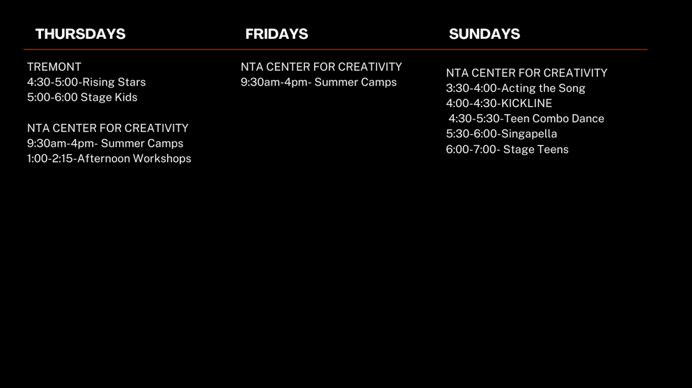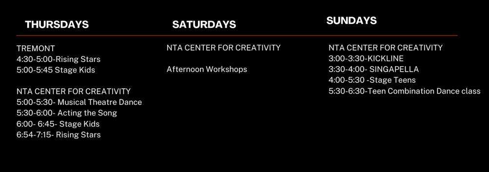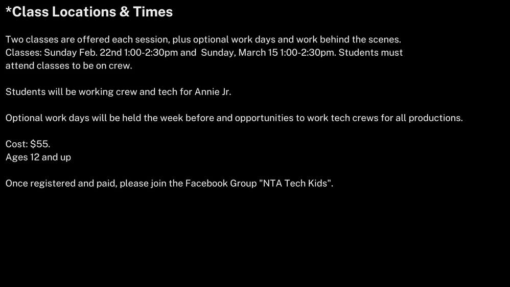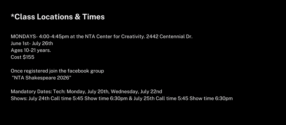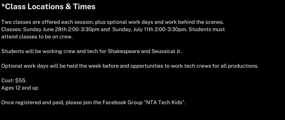 TECH Rehearsals/Show Dates- at the NTA Center For Creativity
