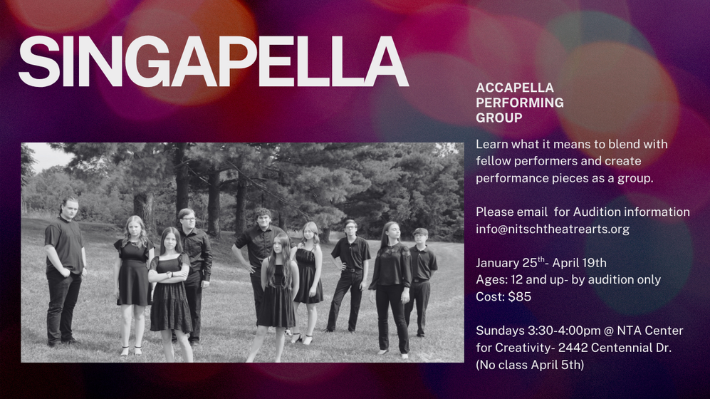 NTA Center for Creativity Tuesday- April 25th 2:45-5pm, April 26th Call time 4pm for 6:30 Show time & April 27th Call time 5:45 for 6:30 show time.